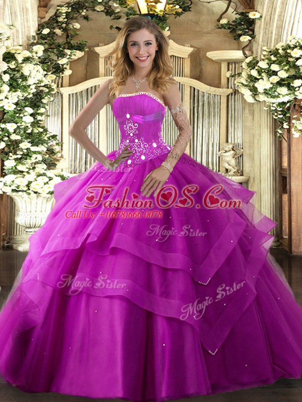 Traditional Fuchsia Ball Gowns Beading and Ruffled Layers Quinceanera Dress Lace Up Tulle Sleeveless Floor Length