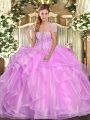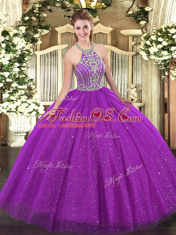 Fuchsia Ball Gowns Beading Sweet 16 Dresses Lace Up Tulle Sleeveless Floor Length