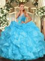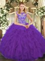 Deluxe Lavender Ball Gowns Strapless Sleeveless Organza Floor Length Lace Up Appliques and Ruffles Quinceanera Gowns