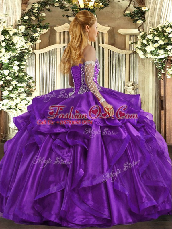Sleeveless Organza Floor Length Lace Up Sweet 16 Dresses in Purple with Beading and Ruffles