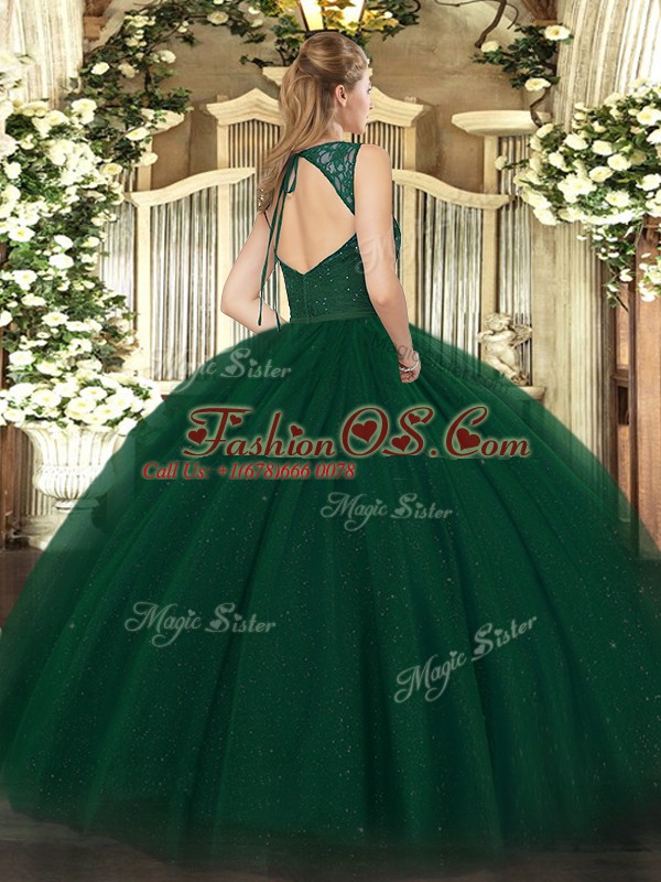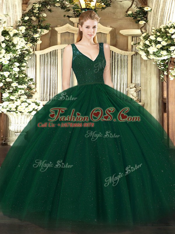 Glittering Dark Green Ball Gowns V-neck Sleeveless Tulle and Sequined Floor Length Zipper Beading 15 Quinceanera Dress