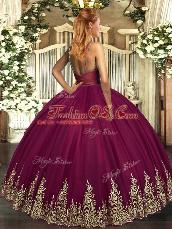 Purple Ball Gowns Tulle V-neck Sleeveless Appliques Floor Length Backless Ball Gown Prom Dress