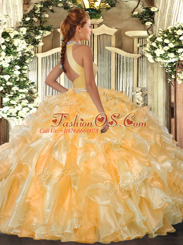 Modest Hot Pink Sleeveless Floor Length Beading and Ruffles Backless Sweet 16 Quinceanera Dress