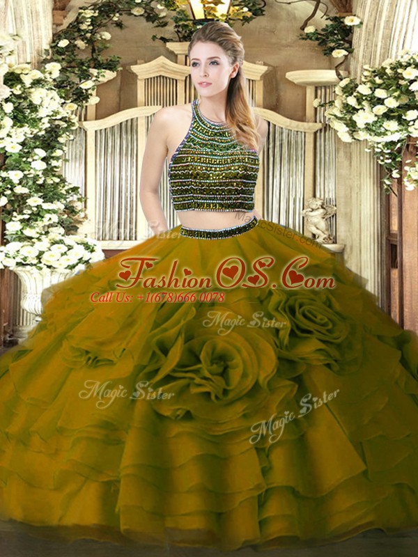 Enchanting Olive Green Zipper 15th Birthday Dress Beading and Ruffled Layers Sleeveless Floor Length