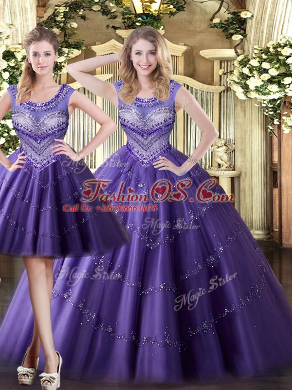 Deluxe Purple Scoop Lace Up Beading 15 Quinceanera Dress Sleeveless