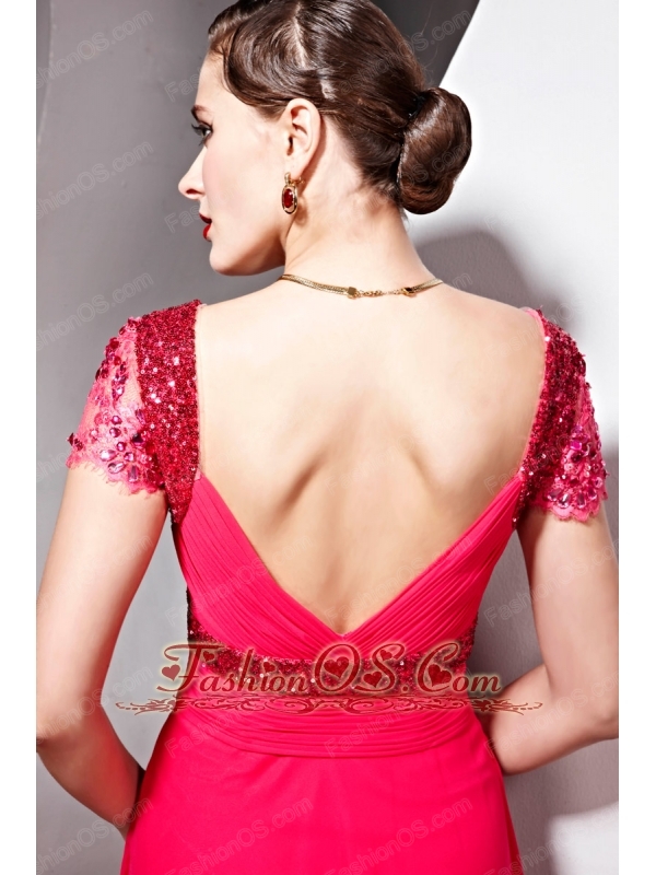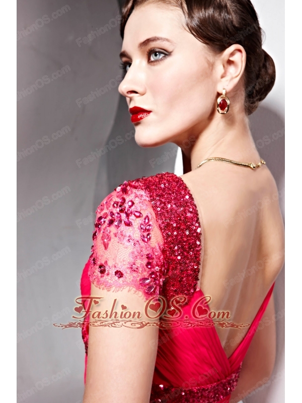 This red dress features a pretty sweetheart neckline and cap sleeves that are heavily embellished with intricate rhinestone and sequince accents. The bodice texture is woven in a lovely basket weave pattern of satin chiffon and shinning sequince that adds lots of visual interest to the design. The floor-length skirt is light and airy so that it moves beautifully when you do. Also the exposed back expresses a style of sexy.This is a very flattering design for virtually any body shape.