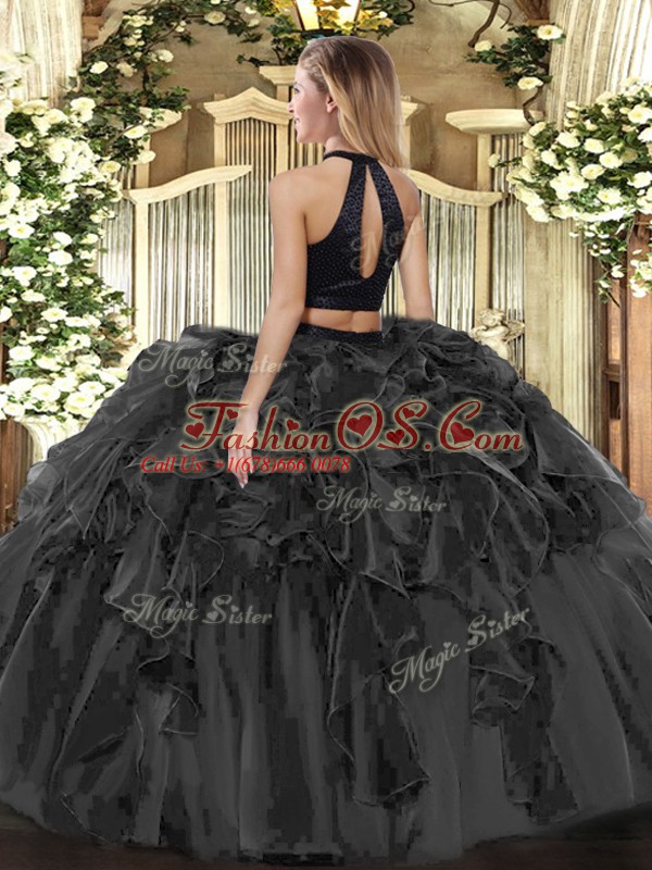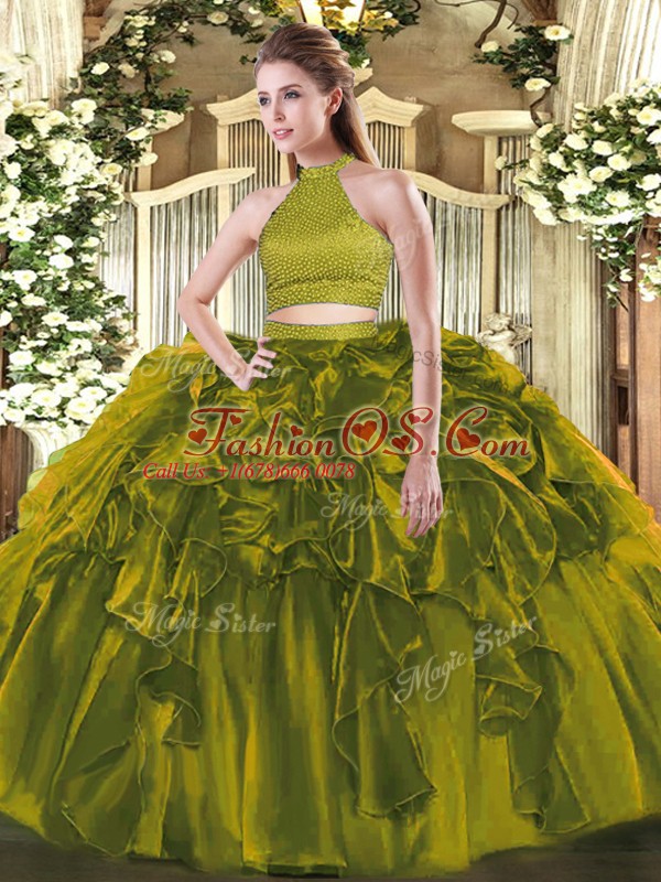 Custom Made Olive Green Organza Backless Ball Gown Prom Dress Sleeveless Floor Length Beading and Ruffles