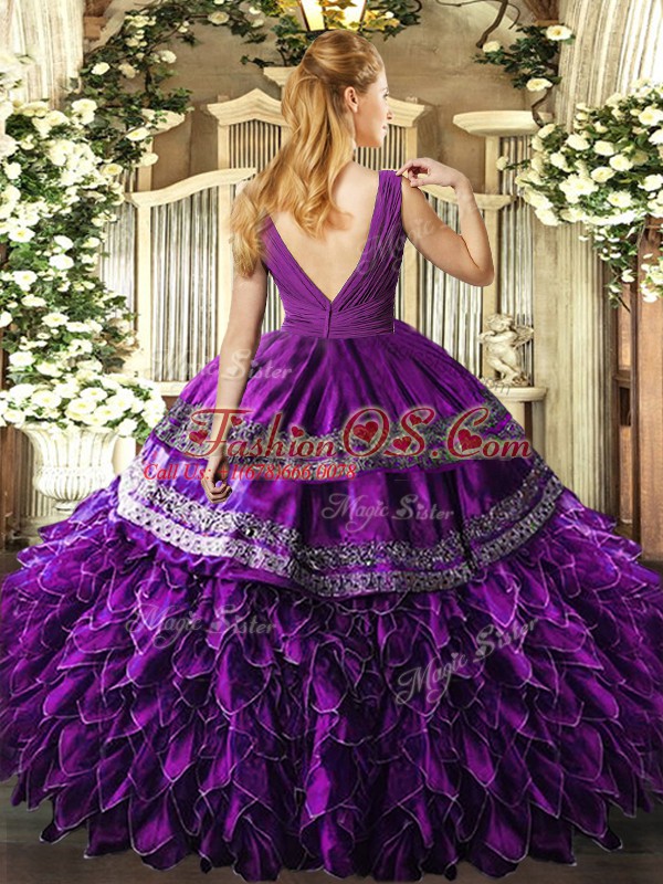 Gorgeous Purple Ball Gowns V-neck Sleeveless Organza Floor Length Backless Beading and Ruffles and Ruching Sweet 16 Quinceanera Dress