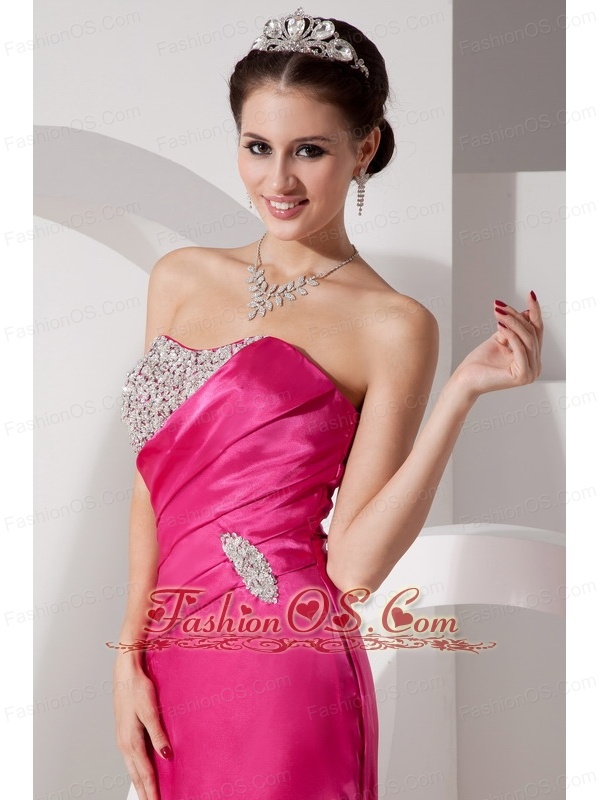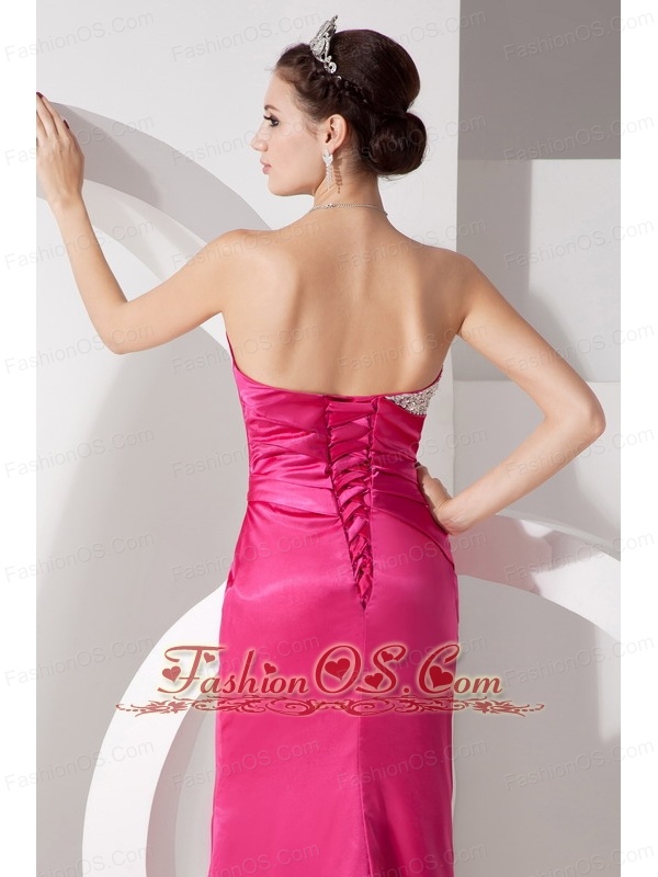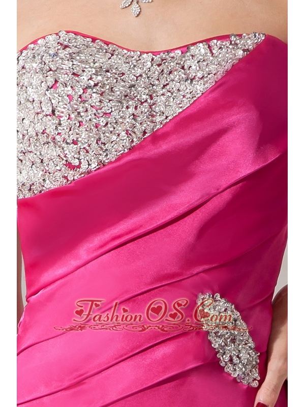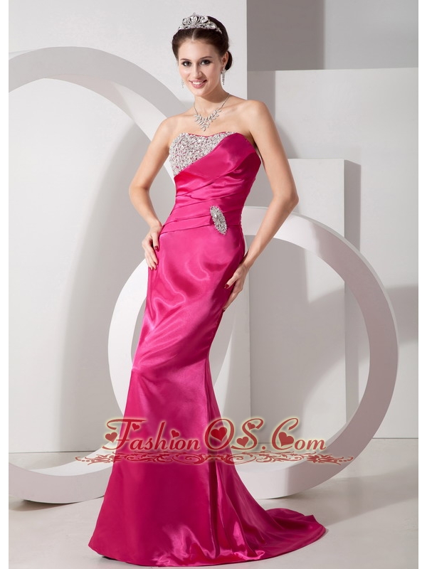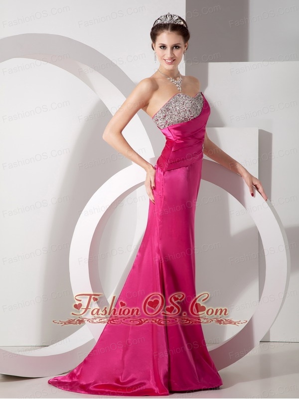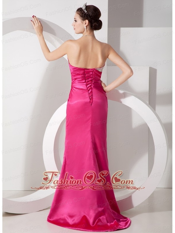 Vintag Hot Pink Column Sweetheart Prom Dress Satin Beading and Ruch Brush Train