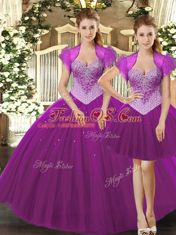 Fuchsia Sleeveless Floor Length Beading Lace Up Quinceanera Gown