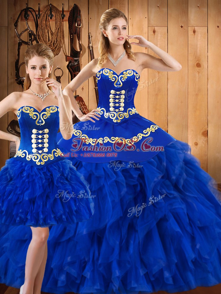 Satin and Organza Sweetheart Sleeveless Lace Up Embroidery and Ruffles Quinceanera Dresses in Blue
