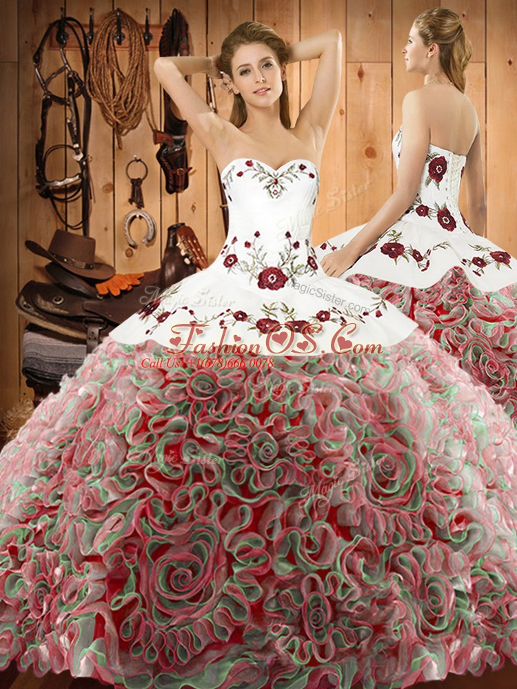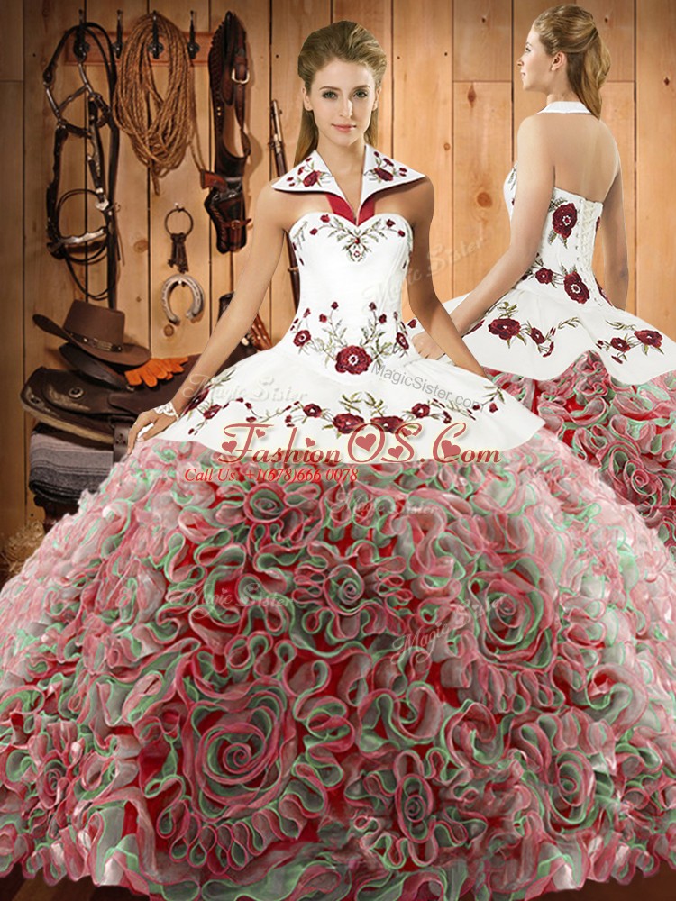 Customized Multi-color Fabric With Rolling Flowers Lace Up Halter Top Sleeveless Vestidos de Quinceanera Sweep Train Embroidery