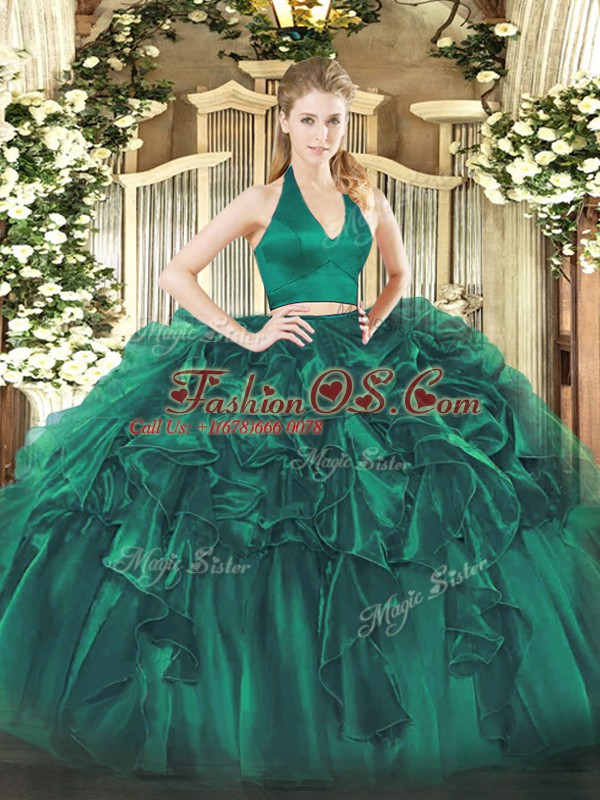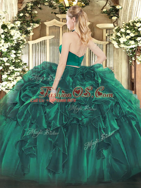 Amazing Dark Green Two Pieces Organza Halter Top Sleeveless Ruffles Floor Length Zipper Quinceanera Gown