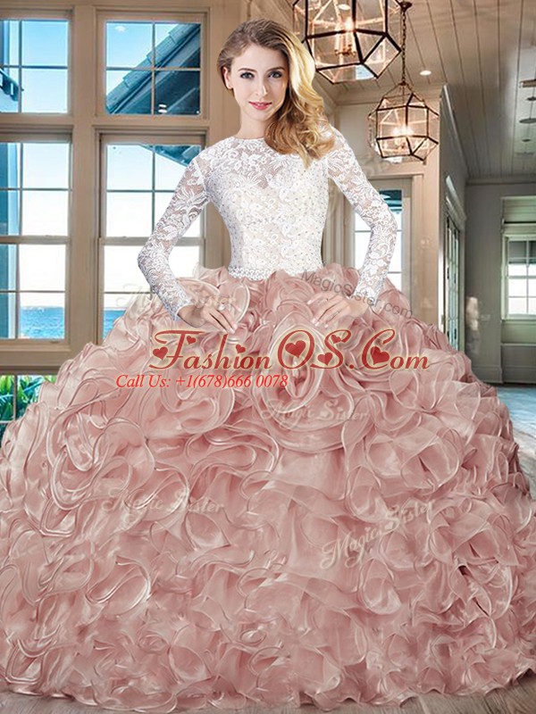 Beauteous Scoop Long Sleeves Lace and Fabric With Rolling Flowers Vestidos de Quinceanera Beading and Ruffles Brush Train Lace Up