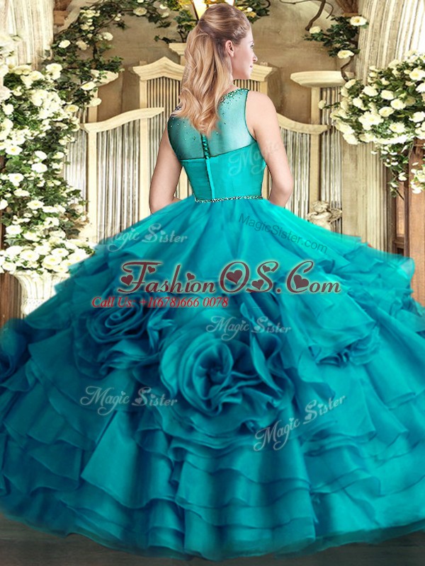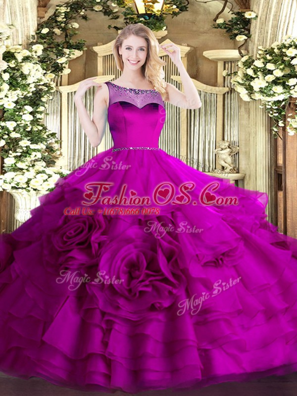 Nice Sleeveless Organza Floor Length Zipper Sweet 16 Quinceanera Dress in Fuchsia with Beading and Ruffled Layers