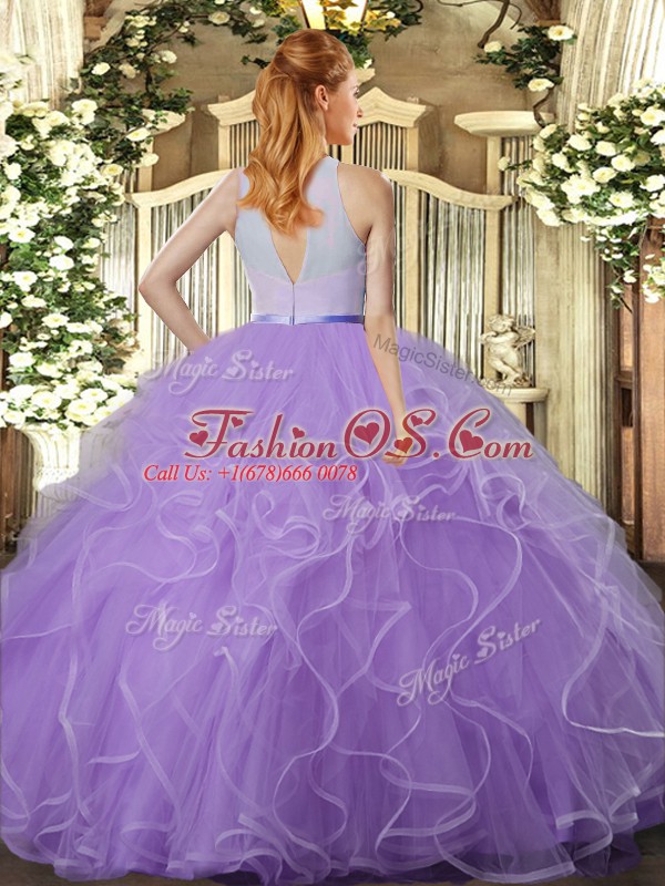 Rose Pink Ball Gowns Tulle Scoop Sleeveless Beading and Ruffles Floor Length Backless Quinceanera Dresses