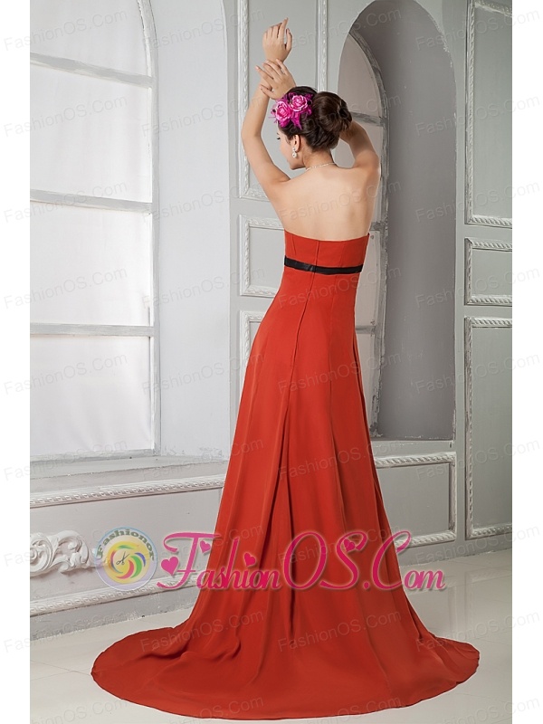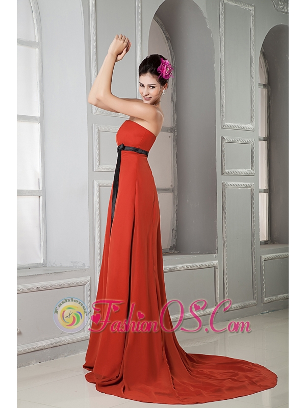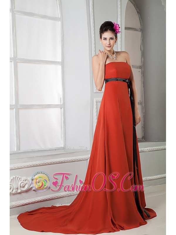 Elegant Rust Red Column Strapless Prom / Homecoming Dress Chiffon Sash Brush Train