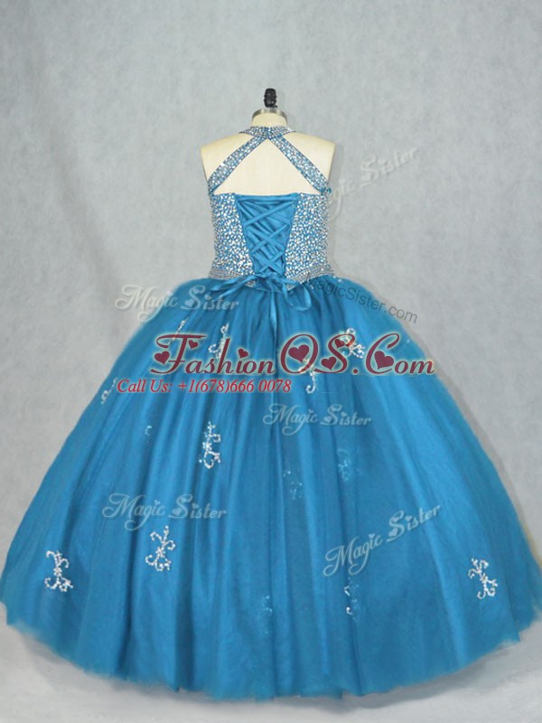 Sleeveless Tulle Floor Length Lace Up 15th Birthday Dress in Blue with Beading and Appliques