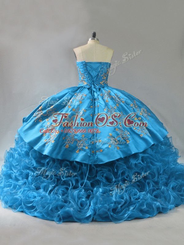 Brush Train Ball Gowns Quince Ball Gowns Blue Sweetheart Fabric With Rolling Flowers Sleeveless Lace Up