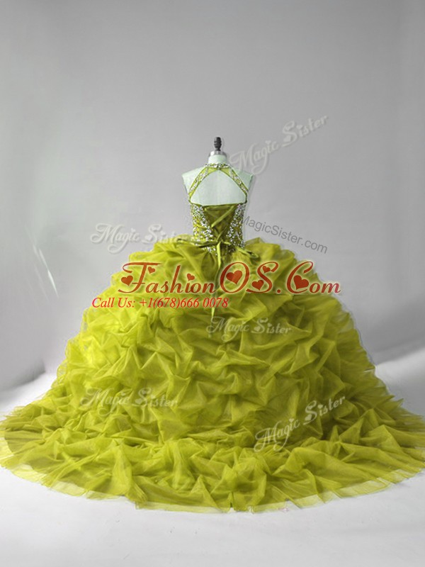 Olive Green Ball Gowns Beading and Pick Ups Sweet 16 Quinceanera Dress Lace Up Tulle Sleeveless