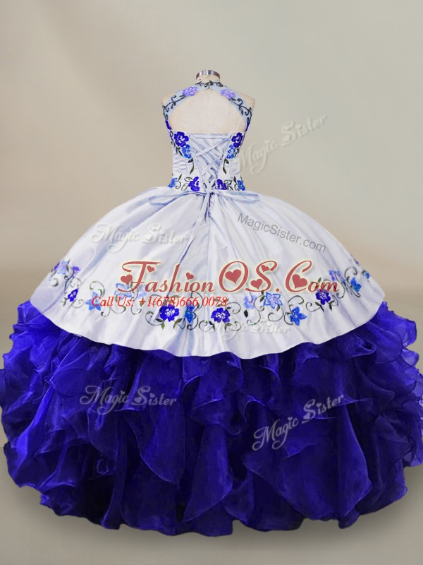 Dazzling Floor Length Blue And White Sweet 16 Dress Halter Top Sleeveless Lace Up