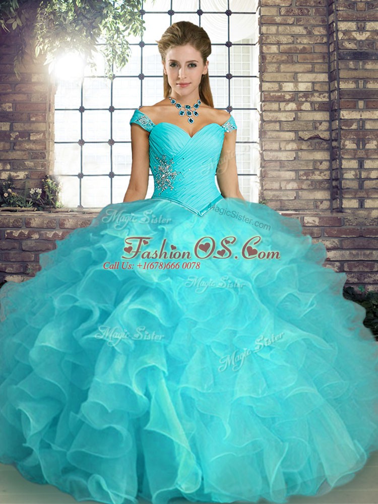 Floor Length Lace Up Quince Ball Gowns Aqua Blue for Military Ball and Sweet 16 and Quinceanera with Beading and Ruffles