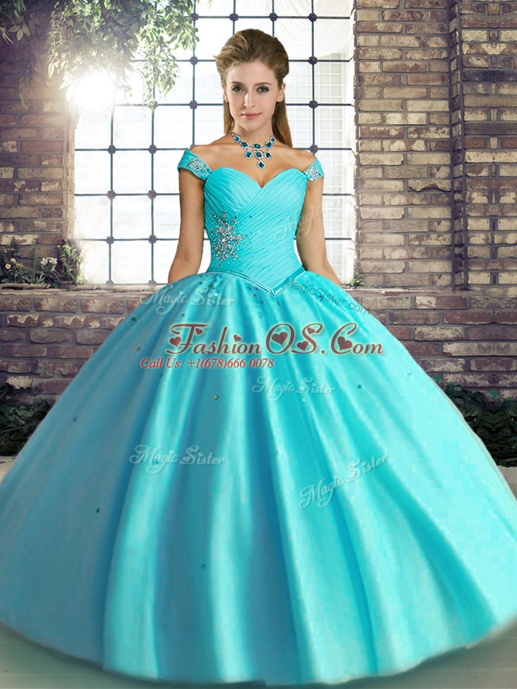Spectacular Aqua Blue Quinceanera Dresses Military Ball and Sweet 16 and Quinceanera with Beading Off The Shoulder Sleeveless Lace Up