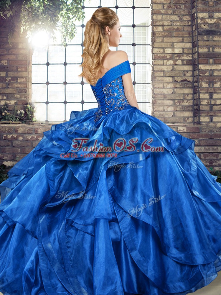 Artistic Baby Blue Off The Shoulder Neckline Beading and Ruffles Quinceanera Gown Sleeveless Lace Up