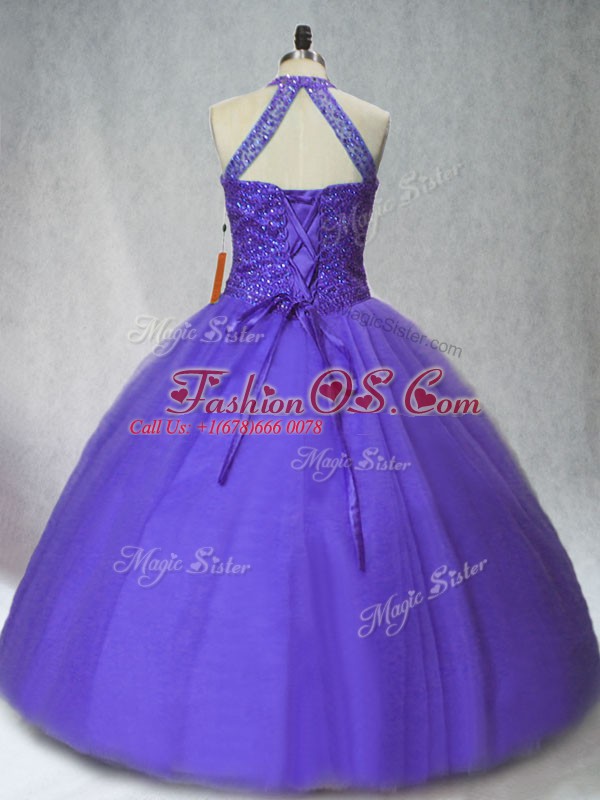 Tulle Halter Top Sleeveless Lace Up Beading Quinceanera Dress in Purple