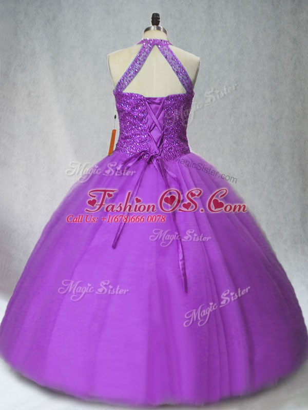 Dynamic Purple Halter Top Neckline Beading Quince Ball Gowns Sleeveless Lace Up
