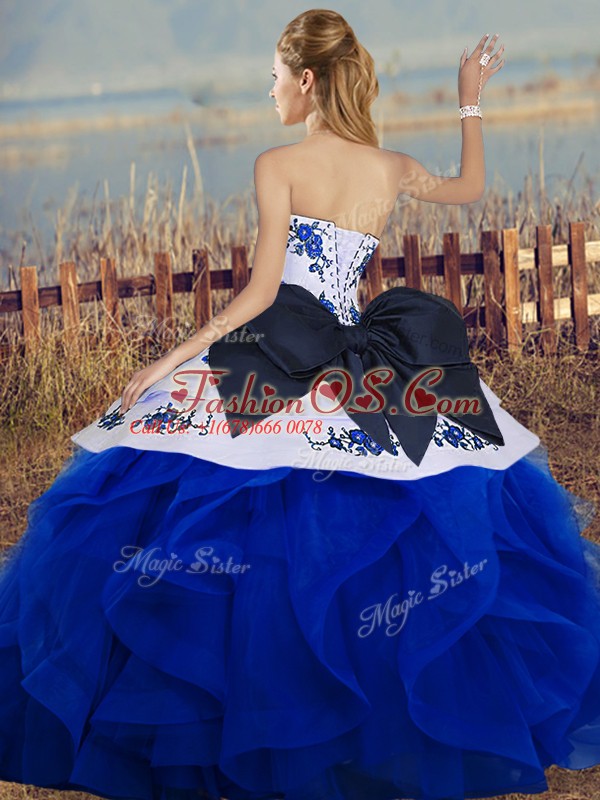 Chic Blue And White Tulle Lace Up Sweetheart Sleeveless Floor Length Quinceanera Gowns Embroidery and Ruffles and Bowknot