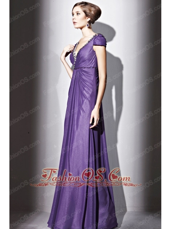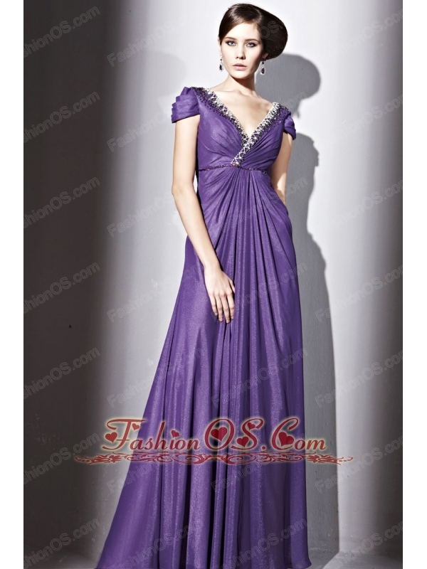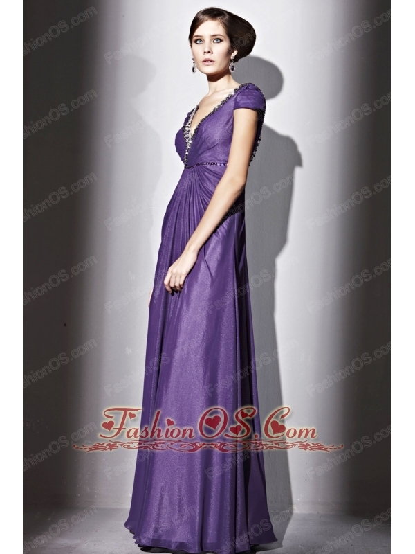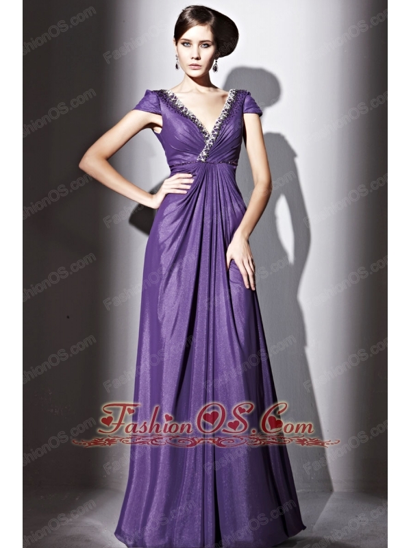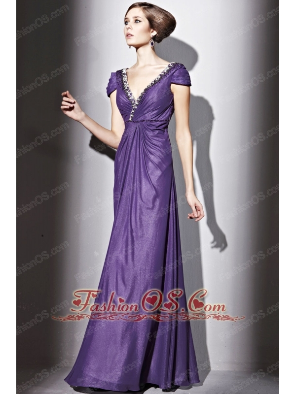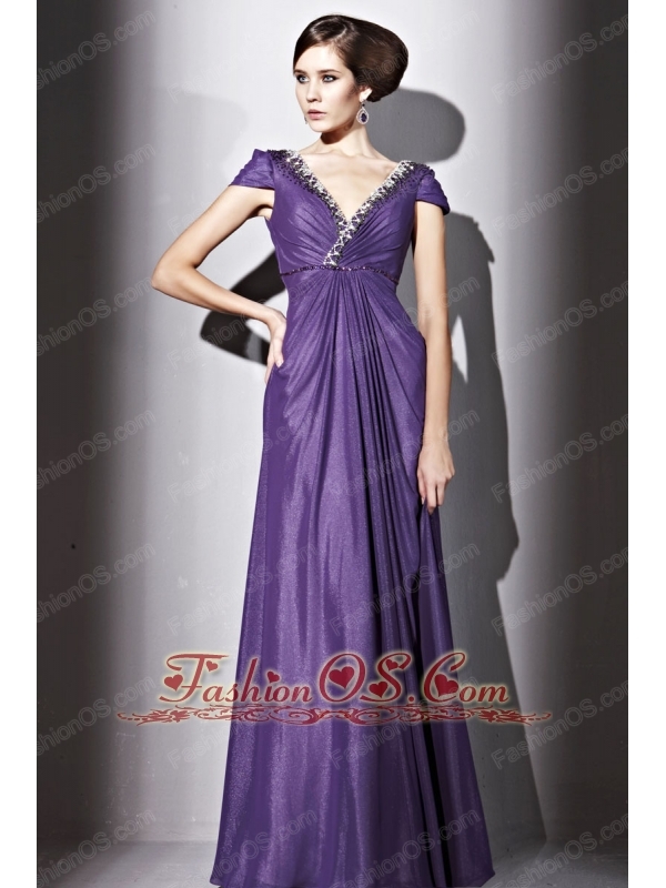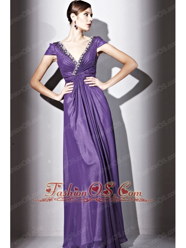 Purple Empire V-neck Floor-length Elastic Wove Satin and Chiffon Beading Prom / Evening Dress
