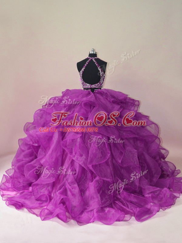 Halter Top Sleeveless Organza Sweet 16 Dresses Beading and Ruffles Brush Train Backless