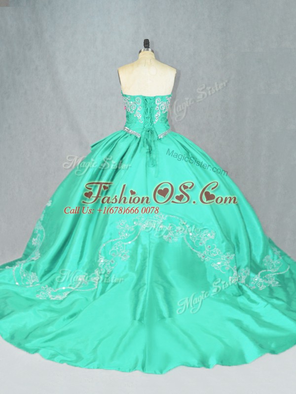 Exquisite Sweetheart Sleeveless Ball Gown Prom Dress Court Train Embroidery Turquoise Satin