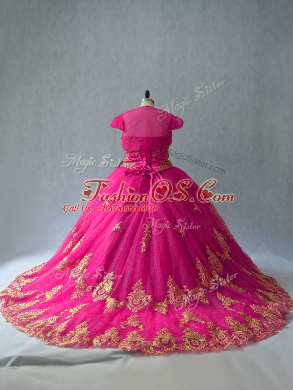 Beautiful Hot Pink Tulle Lace Up Vestidos de Quinceanera Sleeveless Court Train Appliques