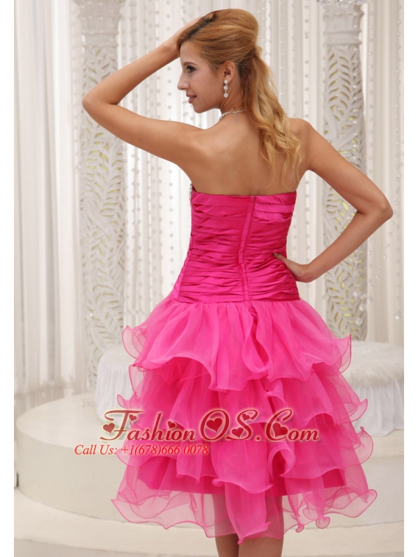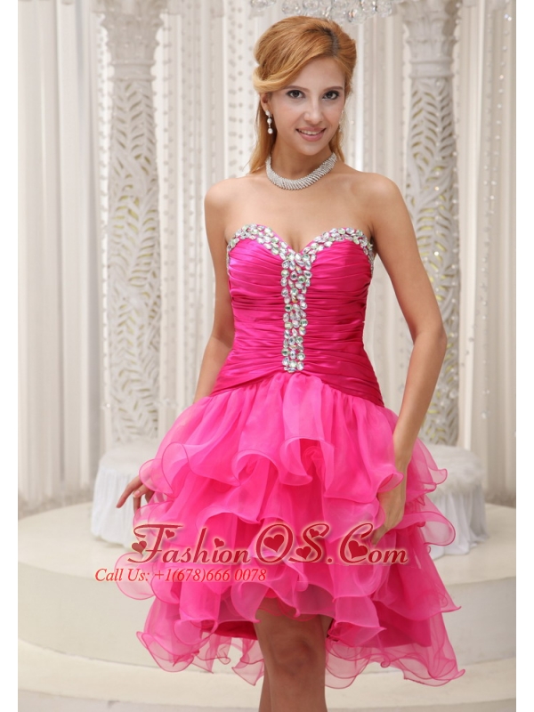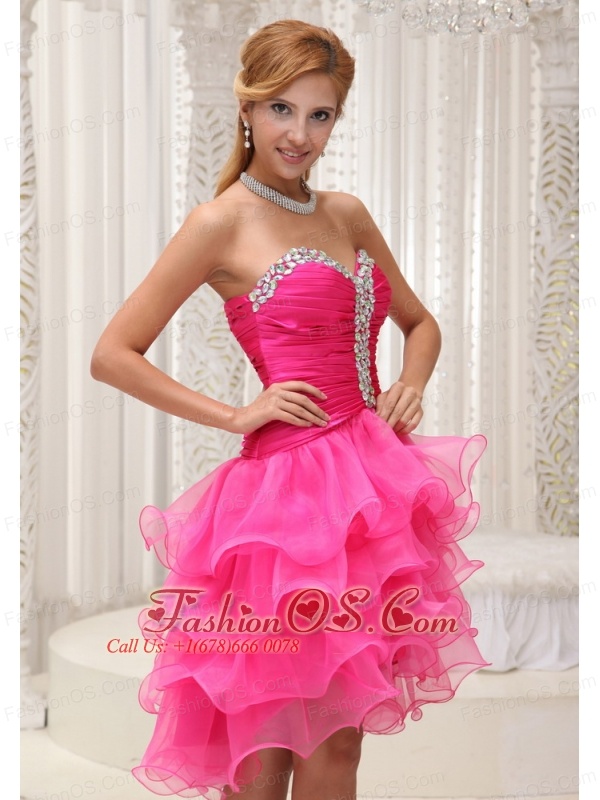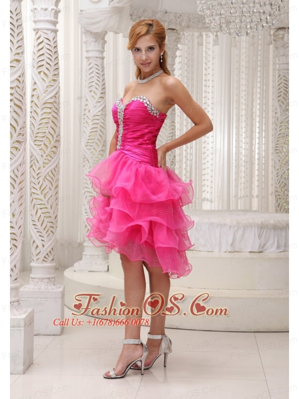This is a beautiful gown and would make a lovely addition to anyone's formal wardrobe! This flirt dress features a beaded sweetheart neckline with flowery crystal accenting on the middle of the fitted ruched bodice. Layers of ruffles complete the cute short skirt and a standingout look. The back is finished with zipper. This dress is available in the colors shown on the color palette.