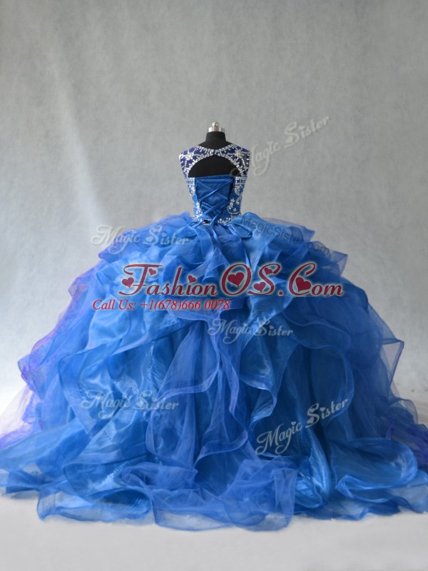 Custom Designed Blue Organza Lace Up Scoop Sleeveless Floor Length Quinceanera Gowns Beading and Ruffles