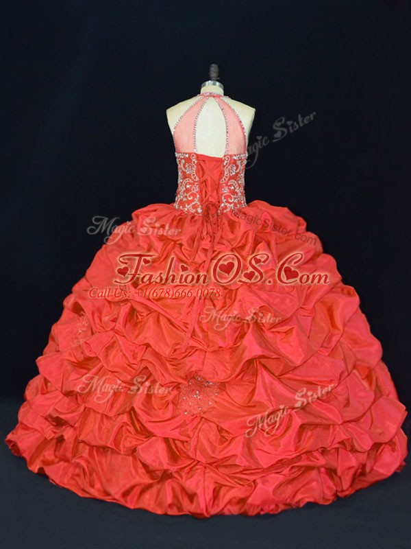 Halter Top Sleeveless Taffeta Quince Ball Gowns Beading and Appliques and Embroidery Lace Up