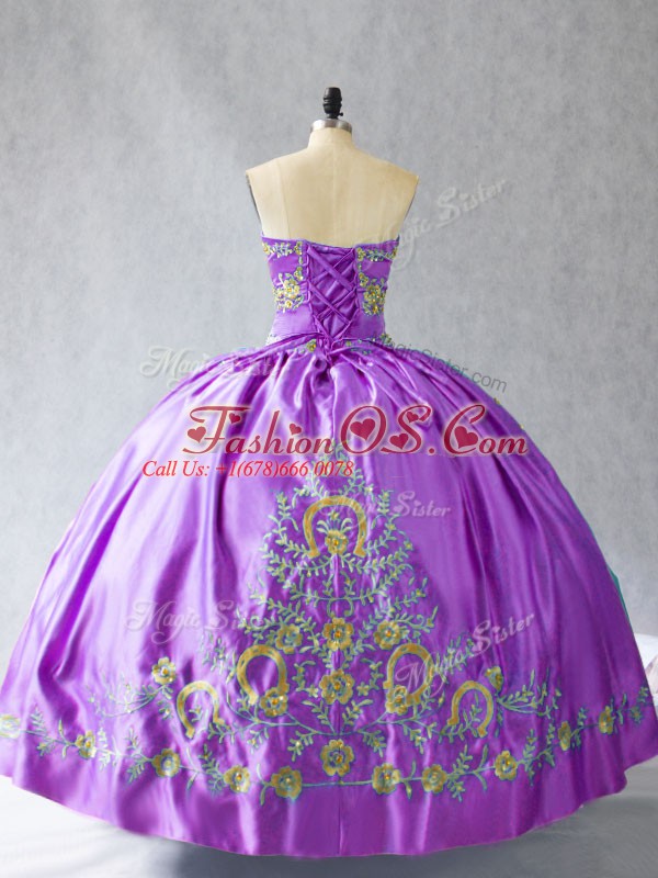 Eye-catching Sleeveless Satin Floor Length Lace Up Vestidos de Quinceanera in Lavender with Embroidery