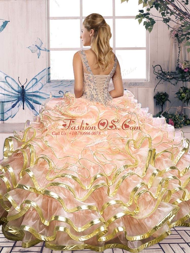 Hot Sale Sleeveless Floor Length Beading and Ruffles Lace Up Sweet 16 Dress with Olive Green