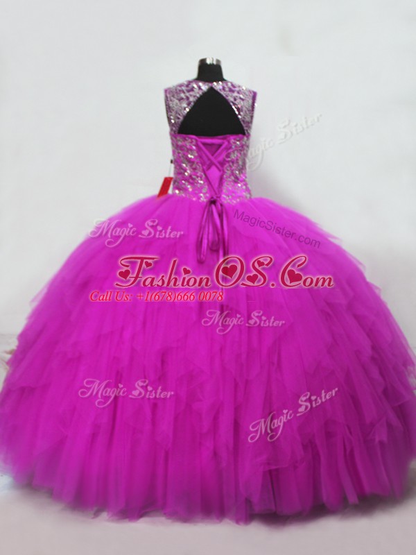 Fuchsia Tulle Lace Up Straps Sleeveless Floor Length 15 Quinceanera Dress Beading and Ruffles