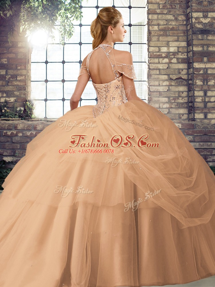 Olive Green Tulle Lace Up 15th Birthday Dress Sleeveless Brush Train Beading and Pick Ups