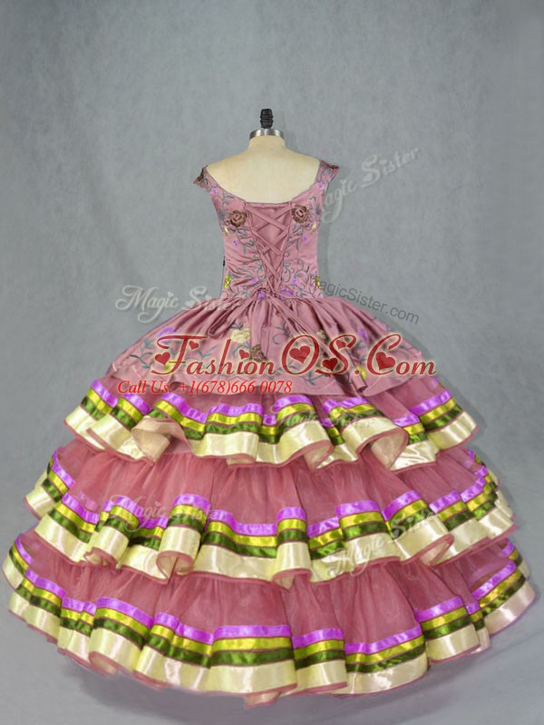 Elegant Floor Length Lace Up Quinceanera Dress Pink for Sweet 16 and Quinceanera with Embroidery and Ruffled Layers