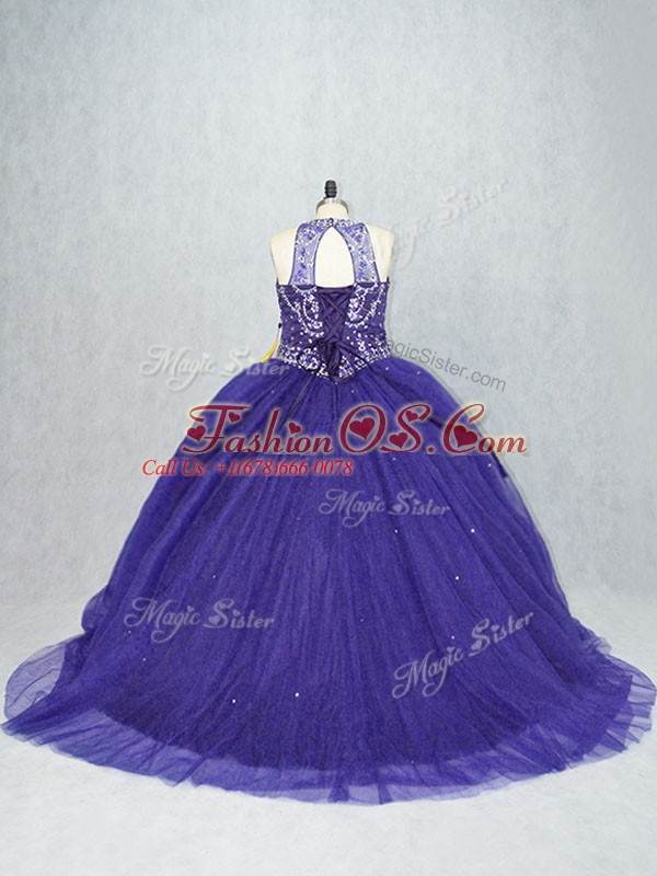 Captivating Purple Sleeveless Tulle Brush Train Lace Up Quinceanera Gown for Sweet 16 and Quinceanera