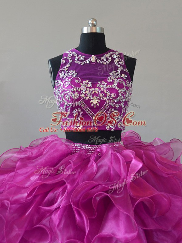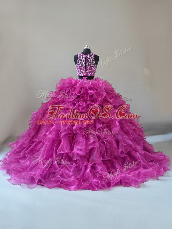 Fuchsia Ball Gown Prom Dress Organza Brush Train Sleeveless Beading and Ruffles