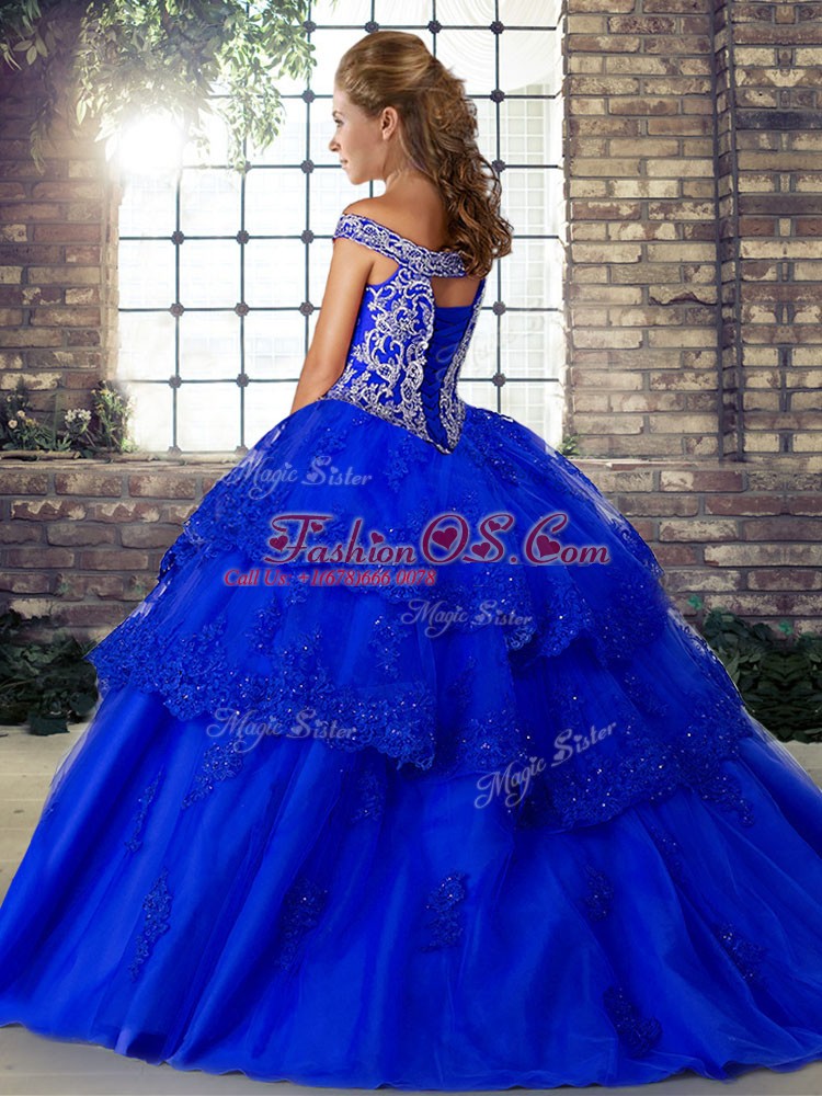 Olive Green Ball Gowns Off The Shoulder Sleeveless Tulle Brush Train Lace Up Beading and Lace Quince Ball Gowns