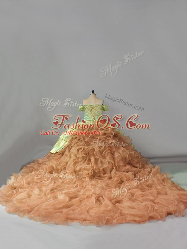 Ideal Multi-color Ball Gowns Off The Shoulder Sleeveless Organza Chapel Train Lace Up Embroidery and Ruffles Sweet 16 Dresses