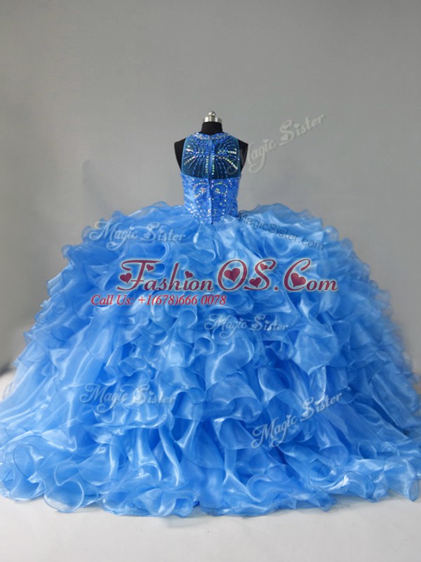 Blue Quince Ball Gowns Sweet 16 and Quinceanera with Beading and Ruffles Scoop Sleeveless Brush Train Zipper