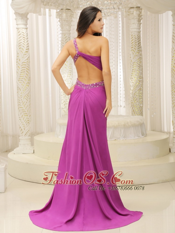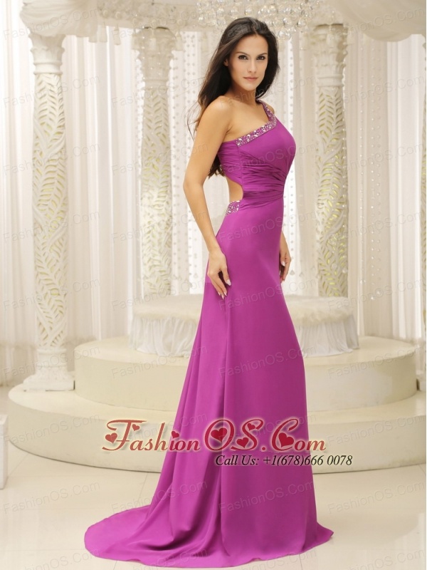 One Shoulder Beaded Decorate Waist Brush Train Chiffon Fuchsia For Evening Dress
