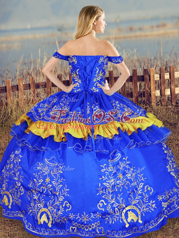 Decent Ball Gowns Vestidos de Quinceanera Blue Off The Shoulder Satin Sleeveless Floor Length Lace Up